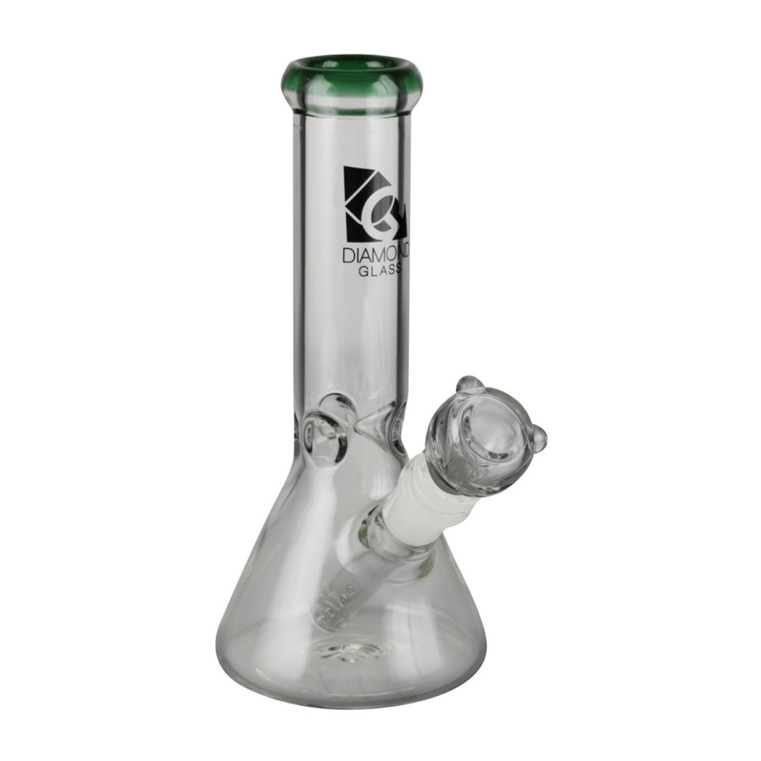 The Diamond Glass Sugar Beaker from our So-Cal artisan friends features super thick clear glass w/ tinted accents, a removable diffused downstem, and large round herb slide. 20cm / 14mm female. Made in the USA.