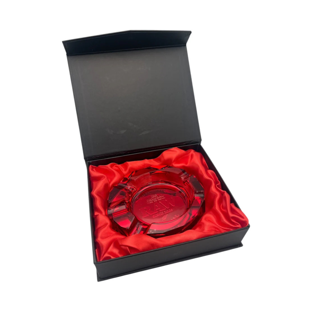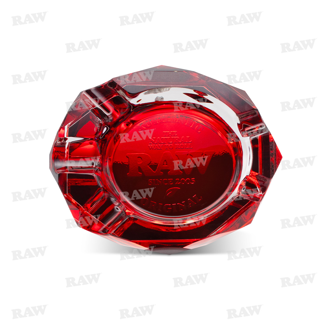 The RAW Solid “Ruby” Glass Red Ashtray features a distinctive elongated octagon design that stands out in any setting. It includes five built-in grooves—two sized for standard cones and three designed for larger cigar-style rolls—making it both stylish and functional.