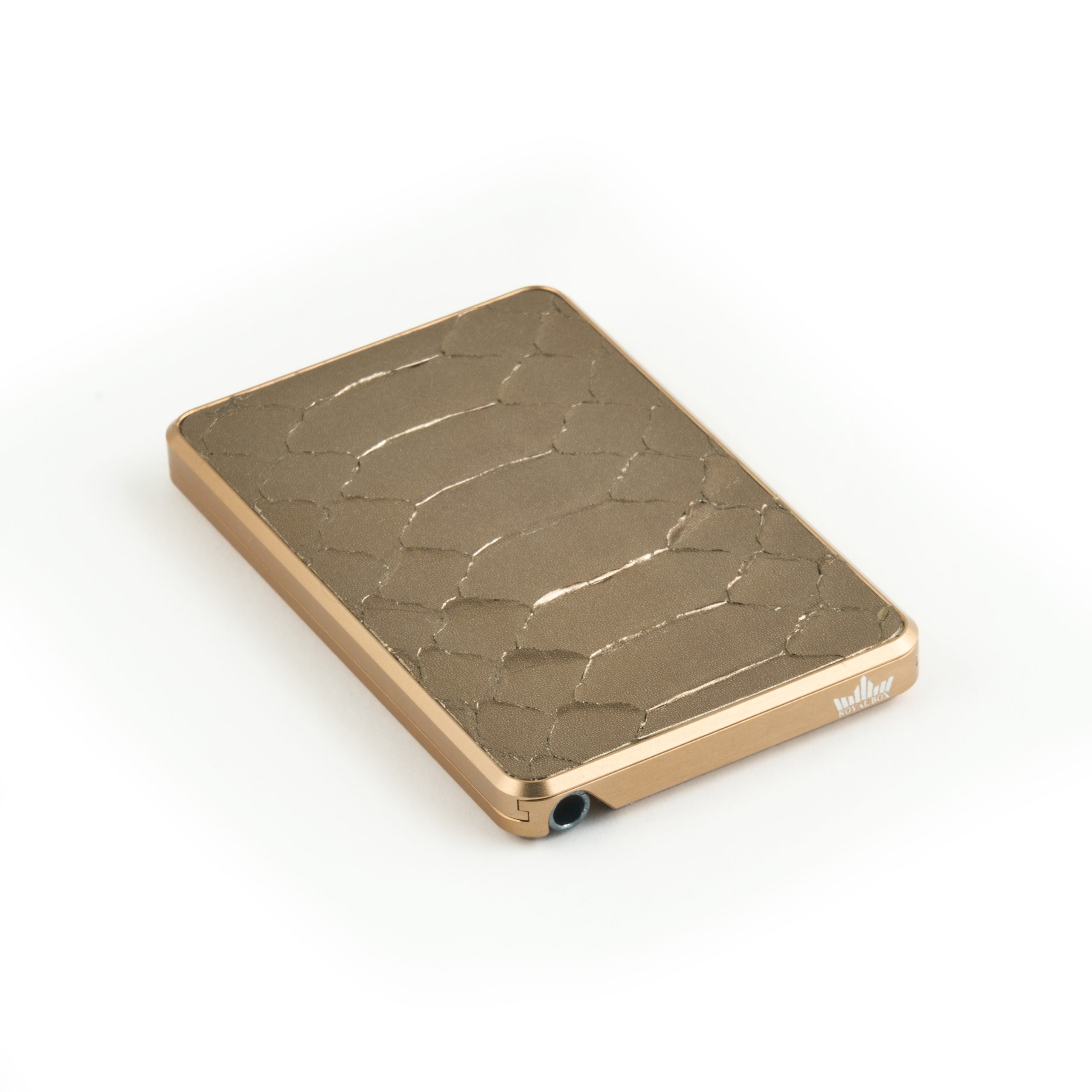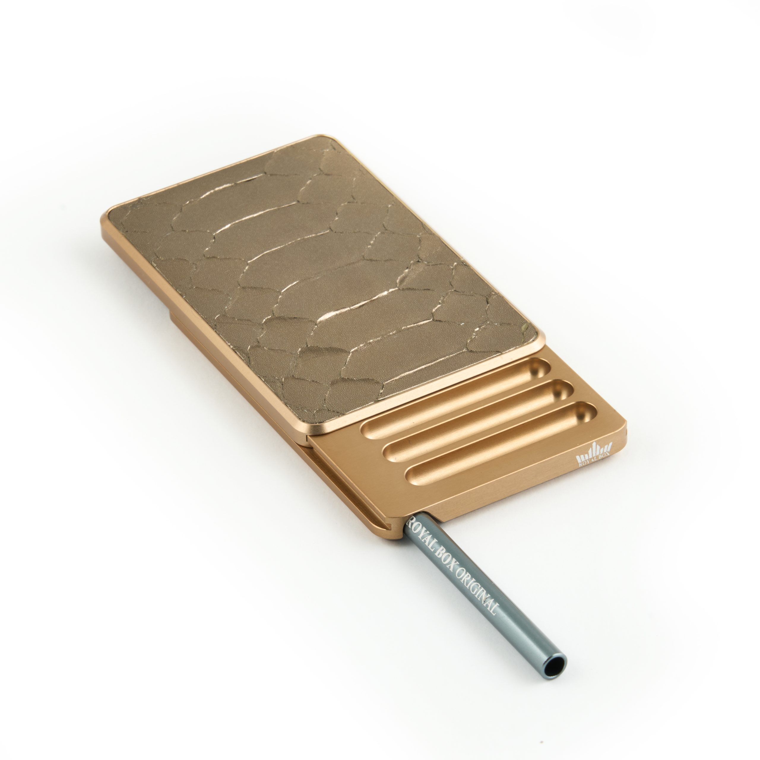 The Champagne Python Edition is the epitome of understated luxury and refined craftsmanship. Inspired by the timeless elegance of champagne, this Royal Box features a python-textured surface in a radiant champagne-gold hue, perfectly complemented by a precision-engineered grooved aluminium base. The result is a harmonious balance of tactile opulence and sleek modern design.