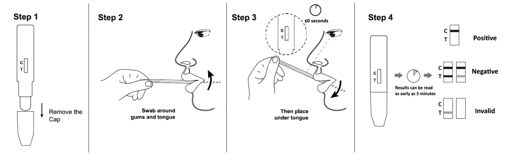 Put the absorbent wick under the tongue to collect oral fluid until the flow appear in the test windows (approximately 60 seconds) and then take out the Device and start a timer.